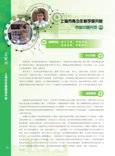 的学习标兵,班级的学习委员。各项活动积极参与,是我校乒乓球冠军。高一我在时政大赛中获得三等奖。在 我荣幸成为了上海市青少年科学研究院的一名小研究员。之后我进入了理事会的秘书处,认真地完成理事长和秘