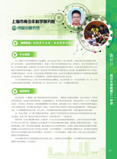 2015 年,我来到了静安区青少年活动中心,在学长和老师的带领下,我第一次动手设计和实施实验,开始 好的运用科学,完成我们每个人的课题研究,还能够丰富我们的科技文化内涵。