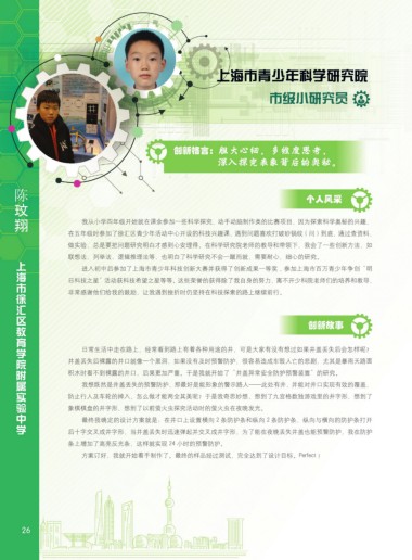 日科技之星”活动获科技希望之星等等。这些荣誉的获得除了我自身的努力,离不开少科院老师们的培养和教导, 上海市青少年科技创新大赛上,我斩获一等奖。上海市百万青少年争创“明日科技之星”评选活动中获“科