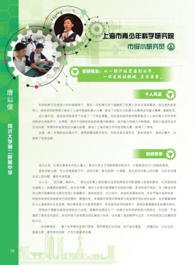 同济大学第二附属中学 究院进行深造学习。在那里,我对于创新和实验的热情不断增加,动手能力和脑力不断提高。我和小组成员合作 成为了由团市委、市教委组织的上海市小学生爱心暑托班志愿者,为小朋友们送去了一份爱心。这些活动锻炼了 上海市复兴高级中学