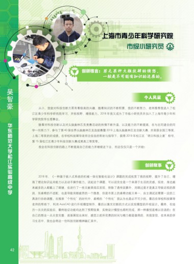 江区青少年科学研究院学习,开拓视野,增强能力。2018 年我又成为了市级小研究员并加入了上海市青少年科 接待了数次市教委领导的到访。目前我在学校,多次主持黄玉峰校长的晨会,获得上海市进博会的开幕仪式旗手