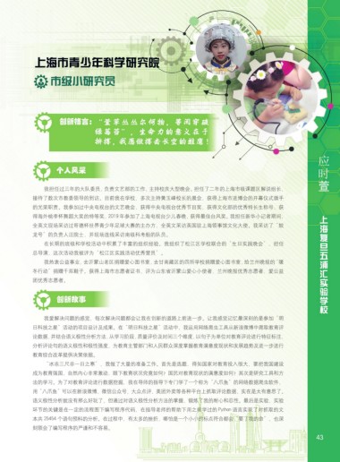 江区青少年科学研究院学习,开拓视野,增强能力。2018 年我又成为了市级小研究员并加入了上海市青少年科 接待了数次市教委领导的到访。目前我在学校,多次主持黄玉峰校长的晨会,获得上海市进博会的开幕仪式旗手