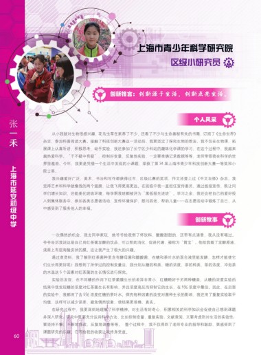 上海市延安初级中学 界里遨游。今年,我更是凭借一个生活中发现的小课题,荣获了第 34 届上海市青少年科技创新大赛一等奖和小 阅读,图书阅览室经常能够看到我的身影;我沉迷手工创作,尤其是蕴含传统文化的中国结和串珠制作;我喜欢 上海市培佳双语学校