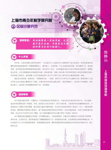 上海市延安初级中学 界里遨游。今年,我更是凭借一个生活中发现的小课题,荣获了第 34 届上海市青少年科技创新大赛一等奖和小 阅读,图书阅览室经常能够看到我的身影;我沉迷手工创作,尤其是蕴含传统文化的中国结和串珠制作;我喜欢 上海市培佳双语学校