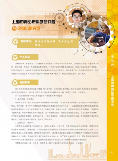 在初中时,我参加了学校的 3D 社团,边学习 3D One 软件的使用,边在老师的引导下进行科技创新。2018 年, 2019 年我成为了上海市青少年科学研究院青浦分院的一名小研究员,同年荣获了区十佳小研究员的称号。2020