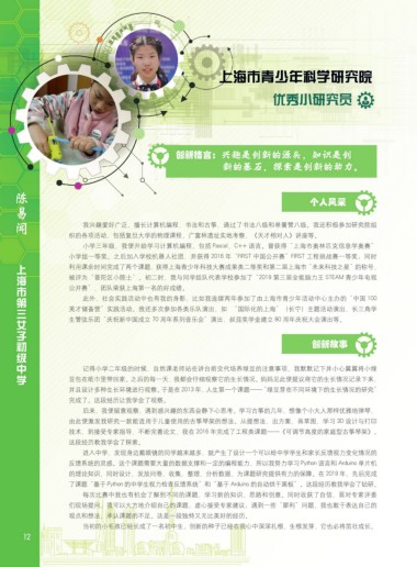 公开赛”,团队荣获上海第一名的好成绩。 赛中,我的参赛作品获得了一等奖及四个专项奖。2020 年,我被评上了“上海市青少年科学研究院优秀小研究员”。