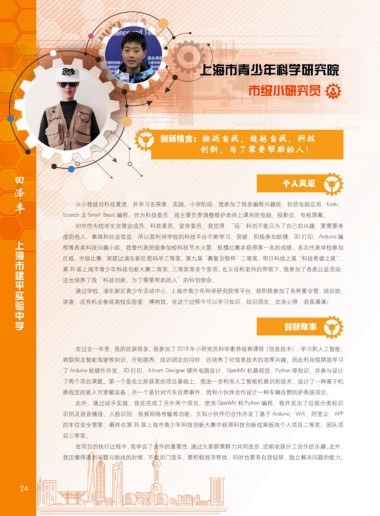 第 35 届上海市青少年科技创新大赛二等奖、三等奖等多个奖项。在父母和老师的带领下,我参加了各类公益活动, 职守的态度完成理事会交给我的每一项任务,也让我的领导管理才能得到了显著的增长。