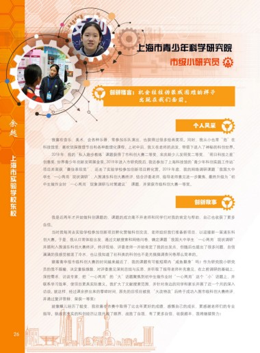 创意奖、世界青少年创新发明展金奖。2019年进入市研究院后,我还参加了上海科技馆的“青少年科创实践工作站” 上海市光明中学