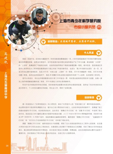 和“上师杯”竞赛获得了市级和区级奖,在老师的指导帮助下荣获创新模型赛一等奖。高中阶段,我在黄浦区劳 生命科学及工程技术科学素养等培训课程。六年级我加入了科技之光社团,由此接触到了许多的科学知识,其间