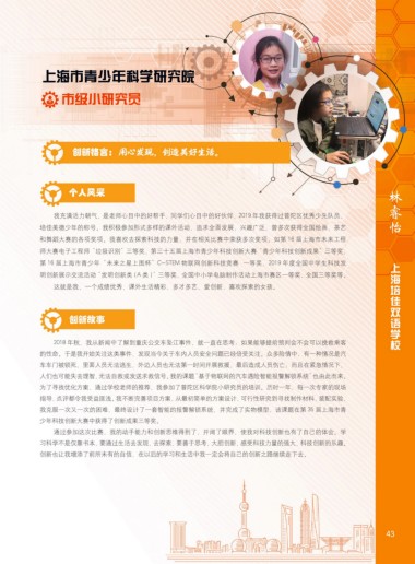 技我能行最佳辩手奖。2020 年社科类的“晚上十点,你睡了吗?”荣获第 35 届上海市青少年科技创新大赛二等