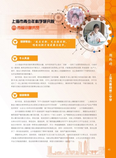 才计划优秀学员称号、第 35 届青少年科技创新大赛一等奖、上海市科学技术协会主席奖。 成为了一名上海市青少年科学研究院小研究员,今后我也会怀着初心,秉持科学严谨的态度,不断完善自我,也