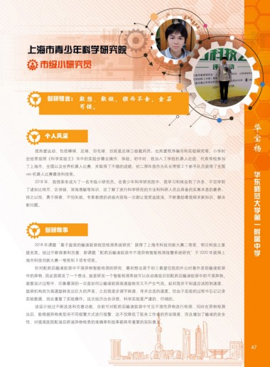 这样的变化过程也是我人生中最难忘的一次成长。带着对科技探究的兴趣与执著,我很荣幸地成为了市级小研究 2018 年,我很荣幸成为了一名市级小研究员。在青少年科学研究院中,我学习和体会到了许多,不仅学到