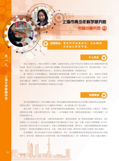 上海大学附属中学 高一我参加了化学精英魔法社、英国皇家化学新星挑战赛,积累了不少化学知识;高二,我参加了科普英 2019 年,我很荣幸地成为了一名市级小研究员。积极参与各类科创活动,我在很多方面都有了一定的进步。 上海大学附属中学实验学校