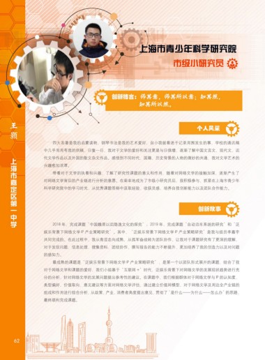 对网络文学背后的产业链进行分析的意愿。在荣幸地成为了市级小研究员后,我积极参与,抓紧在上海市青少年 项目,比如交通大学工程实践站的优秀课题评选、上海市青少年科技创新大赛、上海市小研究员课题研究等,还
