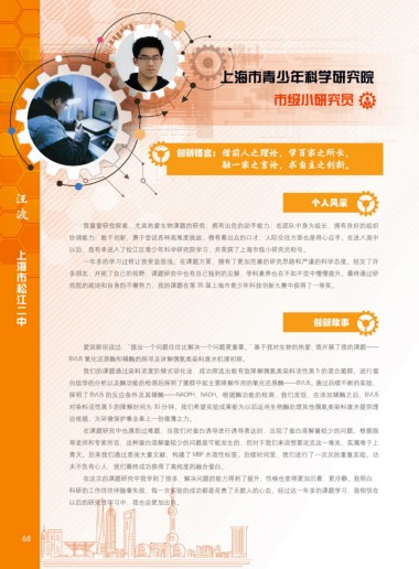 究院的栽培和自身的不懈努力,我的课题在第 35 届上海市青少年科技创新大赛中获得了一等奖。 括前沿高端科学技术普及教育系列活动、暑期科技夏令营等。我在一次次的培训中,体会到了科技的重要性以及