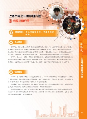 究院的栽培和自身的不懈努力,我的课题在第 35 届上海市青少年科技创新大赛中获得了一等奖。 括前沿高端科学技术普及教育系列活动、暑期科技夏令营等。我在一次次的培训中,体会到了科技的重要性以及