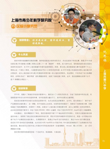 区级小研究员 我初中便开始接触科创类的竞赛,被学校选拔成为校科创队队长,并且征战各个科创比赛,荣获 2016 年浦