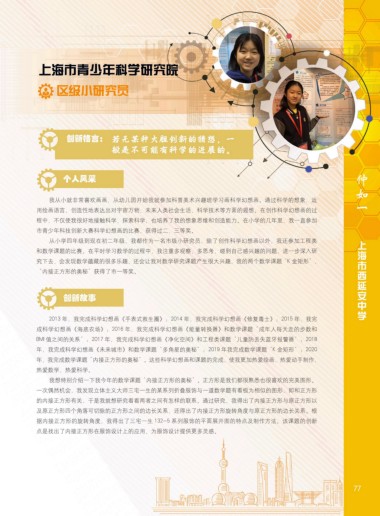 可积 — 一种易擦“双疏”涂层的制备探究”。这些课题开拓了我的视野,增强了我信息处理、动手操作、团队 年,我完成科学幻想画《未来城市》和数学课题“多角星的奥秘”;2019 年我完成数学课题“K 金矩形”;2020