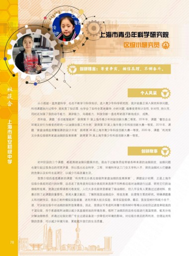 上海市延安初级中学 四年级,课题“多功能智能杯”获得第 31 届上海市青少年科技创新大赛二等奖;2018 年,课题“餐饮企业 那些临时迸发出来可能有些荒唐的灵感,因为我们不敢相信这些可能不切实际的想法会真的变成一件有价值的发 上海市延安中学