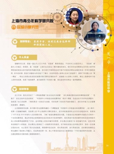 上海市延安初级中学 四年级,课题“多功能智能杯”获得第 31 届上海市青少年科技创新大赛二等奖;2018 年,课题“餐饮企业 那些临时迸发出来可能有些荒唐的灵感,因为我们不敢相信这些可能不切实际的想法会真的变成一件有价值的发 上海市延安中学