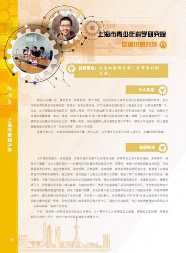 上海市曹杨中学 李遗失提醒装置”荣获三等奖。2020 年参加第 35 届上海市青少年科技创新大赛,课题“公共交通的优化——以 一等奖的好成绩。在与志同道合的伙伴切磋交流的过程中,我热爱上了科技创新的过程。因此,在高一的暑假我 上海市复兴高级中学