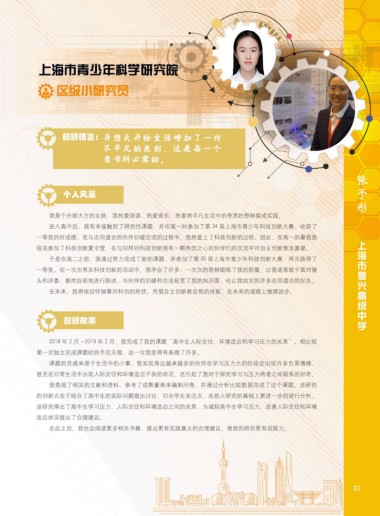 作品“生日蛋糕的纸电路艺术”获得二等奖。2016 年参加第 31 届上海市青少年科技创新大赛,作品“出租车行 进入高中后,我有幸接触到了研究性课题,并在高一时参加了第 34 届上海市青少年科技创新大赛,收获了