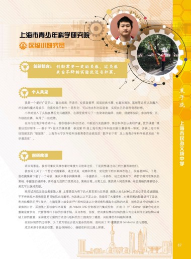 2019 年我被区青少年科学研究院评为“优秀小研究员”,同时,带着对科技探究的兴趣与执著,我在老师的悉 准扶贫好帮手 -- 基于 FPV 技术的摘果器”参加第 35 届上海市青少年科技创新大赛获得一等奖,并获上海市科