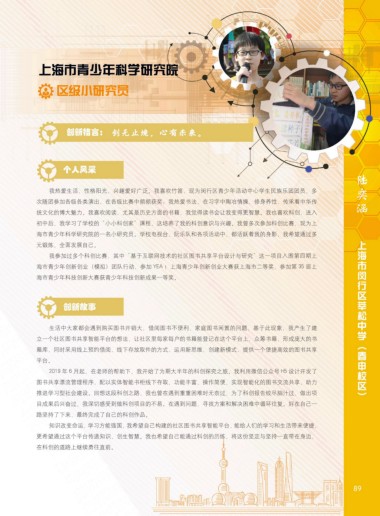 升入初中后,对科技创新活动产生浓厚兴趣的我申请加入了学校的科技社团。在老师的带领下,我多次参 海市青少年创新创业(模拟)团队行动,参加 YEA !上海青少年创新创业大赛获上海市二等奖、参加第 35 届上