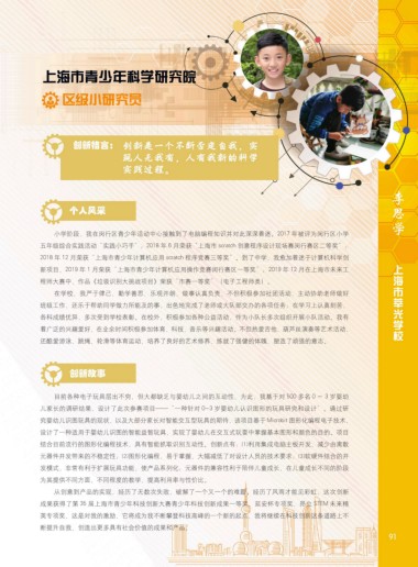 从小学三年级开始,我就在区青少年活动中心开始学习机器人课程,包括编程和组装。学习的过程使我体 小学阶段,我在闵行区青少年活动中心接触到了电脑编程知识并对此深深着迷。2017 年被评为闵行区小学