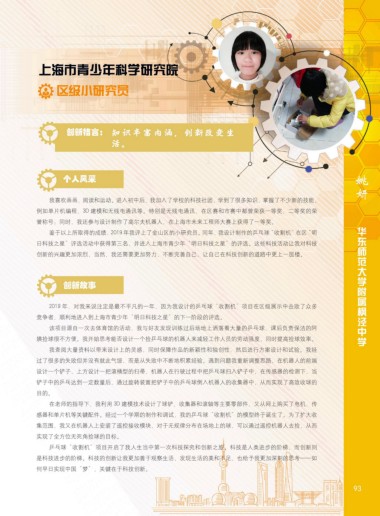 不仅获得了全国青少年创意编程与智能设计大赛一等奖、上海青少年科创大赛一等奖,还获得了实用新型专利授 日科技之星”评选活动中获得第三名,并进入上海市青少年“明日科技之星”的评选。这些科技活动让我对科技