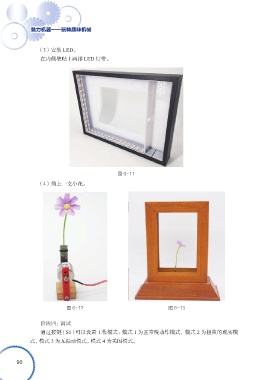 魅力机器——玩转趣味机械 (3) 安装 LED。 在内侧壁贴上两排 LED 灯带。 图 6-11 (4) 插上一支小花。 图 6-12 图 6-13 阶段四:调试 通过按键(S1)可以设置工作模式:模式 1 为正常慢动作模式, 模式 2 为扭曲的现实模 式,模式 3 为无振动模式,模式 4 为关闭模式。 90