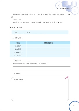 项目六 舞动的相框 舞动效果可以通过调节变阻器(R2)来实现,LED 亮度可以通过调节变阻器(R1)来 实现。 阶段五:分享 展示作品,比比谁的相框中的舞动效果最好,评评谁的作品制作工艺最好。 活动 A 学习单 班级 姓名 1. 观察记录。 模式 观察到的现象 慢动模式 乱扭模式 无振动模式 无灯光模式 2. 活动记录。 在制作与调试过程中遇到了哪些问题?如何解决的? 3. 成果记录。 舞动的相框照片: 91