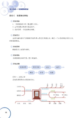 魅力机器——玩转趣味机械 活动 C 创意舞动相框 活动目标 1. 了解创意设计的一般过程与方法。 2. 运用发散思维进行创意设计。 3. 设计制作一个创意舞动相框。 活动简介 运用头脑风暴对与相框相关的各种元素进行发散思考,确定一个心仪的创意设计方案, 并将创意物化。 活动器材 根据设计方案筹备材料。 活动准备 几种新颖的相框实物、图片或视频。 活动步骤 发散思考 确定目标 设计 制作 调试 分享 拓展 阶段一:发散思考 运用发散思维来寻找创意方向。 98