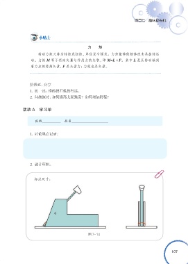 项目七 趣味投石机 小贴士 力 矩 转动力矩又称为转矩或扭矩,单位是牛顿米。力矩能够使物体改变其旋转运 动。力矩 M 等于径向矢量与作用力的矢积,即 M=L×F。其中 L 是从转动轴到 着力点的距离矢量, F 是矢量力;力矩也是矢量。 阶段五:分享 1. 比一比:谁的投石机投得远。 2. 问题探讨:如何提高支架强度?如何增加射程? 活动 A 学习单 班级 姓名 1. 讨论观点记录: 2. 设计草图。 标注尺寸: 图 7-14 107