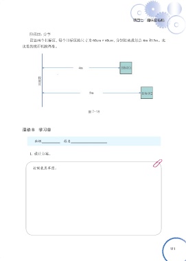 项目七 趣味投石机 阶段四:分享 设置两个目标区,每个目标区的尺寸为 60cm×40cm,分别距离投射点 4m 和 5m。比 比谁的投石机投得准。 图 7-18 活动 B 学习单 班级 姓名 1. 设计方案。 控制装置草图: 111