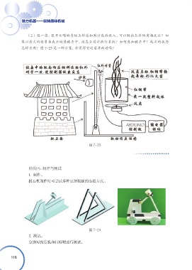 魅力机器——玩转趣味机械 (2) 想一想:张开大嘴的青蛙怎样感知到沙包的投入,可以做出怎样的有趣反应?如 果以着火的情景来表示城堡被击中,该怎么设计执行系统?如何感知被击中?起火的状态 怎样实现?图 7-23 是一种方案,你觉得它还需要改进吗? 图 7-23 阶段四:制作与测试 1. 制作。 投石机制作时可尝试多种更加稳固的连接方式。 图 7-24 2. 测试。 分别对投石机和目标靶进行测试。 116