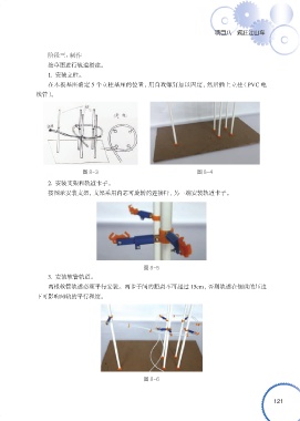 项目八 疯狂过山车 阶段三:制作 按草图进行轨道搭建。 1. 安装立柱。 在木板基座确定 5 个立柱基座的位置,用自攻螺钉加以固定,然后插上立柱(PVC 电 线管)。 图 8-3 图 8-4 2. 安装支架和轨道卡子。 按图示安装支架,支架采用内芯可旋转的连接杆,另一端安装轨道卡子。 图 8-5 3. 安装软管轨道。 两根软管轨道必须平行安装。两卡子间的距离不可超过 15cm,否则轨道在钢珠的压迫 下可影响两轨的平行程度。 图 8-6 121