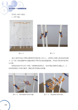 魅力机器——玩转趣味机械 阶段四:制作与测试 1. 水平飞跃。 图 8-13 图 8-14 成功飞跃的理论计算和实际状况可能有较大的出入,其原因是钢珠与轨道间的摩擦 力、空气阻力和轨道刚性对能量的吸收等原因造成的能量损耗。因此在实际制作时要留 有余量。 钢珠着陆时往往会发生弹跳,导致钢珠脱离轨道。原因可能是钢珠的动能过大、另一 端轨道的姿态不佳或不稳固。因此需要采取相应的措施。 图 8-15 用饮料瓶制作的保护装置 图 8-16 用轨道制作的保护围栏 126
