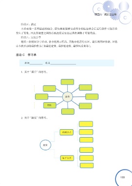 项目八 疯狂过山车 阶段五:调试 本活动是一系列装置的组合,原先单独能够完成任务的装置整合后运行条件可能已经 发生了变化,因此各装置之间的有机连接需要经过多次调整才可能完成。 阶段六:交流分享 组织一次创客分享活动,各小组展示作品,其他小组进行点评。最后利用评价表,评选 出本次活动的最佳作品(如最稳定奖、最佳创意奖、最佳风采奖等)。 活动 C 学习单 班级 姓名 1. 关于“提升”的思考。 提升 杠杆 2. 关于“触发”的思考。 机械方式 触发 电子方式 133
