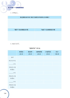 魅力机器——玩转趣味机械 3. 方案设计。 轨道整体设计图(要求方案有文字说明以及草图) “提升”机关局部设计图 “触发”机关局部设计图 4. 交流与分享。 “连锁控制”评价表 完成度 稳定性 结构新颖 小组风采 总分 25 分 25 分 25 分 25 分 100 分 自评 优点与不足 小队 对他们小组 的建议 小队 对他们小组 的建议 小队 对他们小组 的建议 134