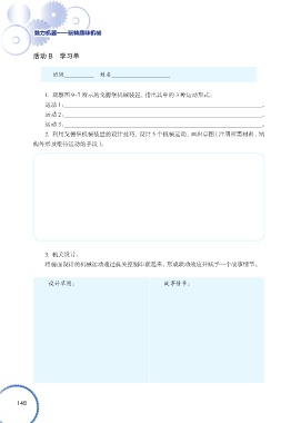 魅力机器——玩转趣味机械 活动 B 学习单 班级 姓名 1. 观察图 9-7 所示的戈德堡机械装置,指出其中的 3 种运动形式: 运动 1: 。 运动 2: 。 运动 3: 。 2. 利用戈德堡机械装置的设计技巧,设计 5 个机械运动,画出草图(注明所需材料、结 构外形及维持运动的手段)。 3. 机关设计。 将前面设计的机械运动通过机关控制串联起来,形成联动效应并赋予一个故事情节。 设计草图: 故事情节: 148
