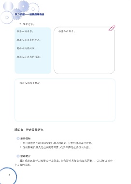 魅力机器——玩转趣味机械 2. 成果记录。 机器人的名字: 机器人的照片: 机器人是否走到终点: 到终点所花时间: 机器人还存在的问题: 机器人的行走轨迹: 活动 B 行走效能研究 活动目标 1. 利用观察法发现四脚行走机器人的缺陷,分析后提出改良方案。 2. 分析影响机器人行走效能的因素,改善四脚行走机器人性能。 活动简介 通过观察四脚行走机器人行走状态,探究影响其行走状态的因素,并尝试解决至少一 个方面的问题。 8