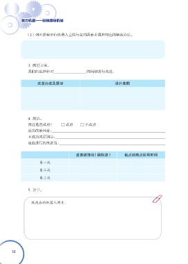 魅力机器——玩转趣味机械 (2) 列出影响步行机器人直线行走的因素并提出相应的解决办法。 3. 改进方案。 我们组选择针对 的问题进行改进。 改进办法及原理 设计草图 4. 测试。 改进是否成功? □ 成功 □ 不成功 成功的原因是: 不成功的原因是: 还能进行的改进是: 走直线情况(画轨迹) 起点到终点所用时间 第一次 第二次 第三次 5. 分享。 改进后的机器人照片: 12