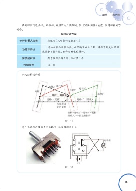 项目一 步行者 两侧的脚由电动机分别驱动,并用双向开关控制,便可实现机器人前进、倒退和转向等 动作。 我的设计方案 步行机器人名称 征服者(双电机六足机器人) 增加电机和遥控功能,四只脚变成六只脚,增强了行走时的稳 功能和特点 定性和可操作性,底部粘贴橡胶材料。 需要的材料 创意模型套材 2 份、线控器 1 个 特制零件 六只脚 六足结构设计图: 图 1-15 单个电动机的双向开关电路图(双刀双掷开关): 图 1-16 15