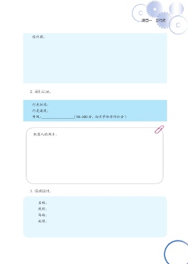 项目一 步行者 设计图: 2. 运行记录。 行走状况: 行走速度: 外观: (50~100 分,由同学和老师打分) 机器人的照片: 3. 活动设计。 名称: 规则: 场地: 成绩: 17