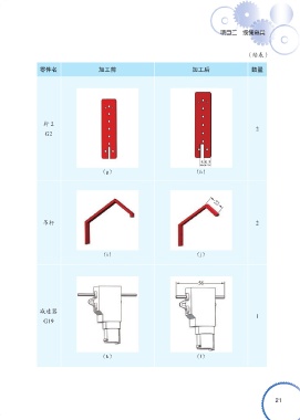 项目二 缆绳奇兵 (续表) 零件名 加工前 加工后 数量 杆 2 2 G2 (g) (h) 吊杆 2 (i) (j) 减速器 1 G19 (k) (l) 21