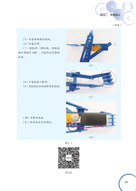 项目二 缆绳奇兵 (续表) (5) 安装曲柄连杆机构。 (6) 安装手臂。 (7) 装配另一侧机构。两侧曲 柄必须相差 180°,才能形成交替的 运动。 (b) (8) 安装机器人腿部。 (9) 用红线标出的零件需要粘结。 (c) (10) 安装电池盒。 (11) 连接电池与电动机。 (d) 图 2-5 原型机 23