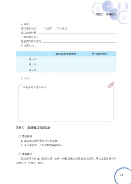 项目二 缆绳奇兵 4. 测试。 改进是否成功? □成功 □不成功 成功的原因是: 不成功的原因是: 还能进行的改进是: 5. 成果记录。 改进或调整的地方 所用爬行时间 第一次 第二次 第三次 6. 分享。 改进后的机器人照片: 活动 C 缆绳奇兵创新设计 活动目标 1. 能运用思维导图进行思维发散。 2. 设计并制作一个新型爬缆绳机器人。 活动简介 运用思维导图进行思维发散,选择一种爬缆绳方式开展设计活动,并自主设计制作所 需的零件,完成加工制作。 29