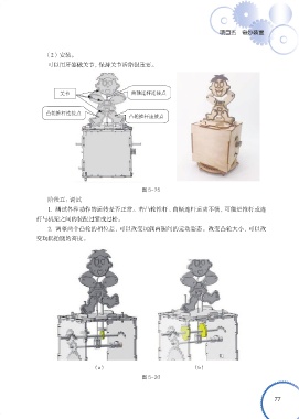项目五 奇妙装置 (2) 安装。 可以用牙签做关节,保持关节活络很重要。 关节 曲轴连杆连接点 凸轮推杆连接点 凸轮推杆连接点 图 5-25 阶段五:调试 1. 测试各种动作的运转是否正常。若凸轮推杆、曲柄连杆运动不畅,可能是推杆或连 杆与机架之间的装配过紧或过松。 2. 调整两个凸轮的相位差,可以改变玩偶两腿间的运动姿态。改变凸轮大小,可以改 变玩偶抬腿的高度。 (a) (b) 图 5-26 77