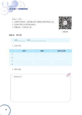 魅力机器——玩转趣味机械 阶段六:分享 1. 分享各自的作品,交流制作过程中遇到的问题及解决方法。 2. 用 PPT 的形式介绍作品的特点。 3. 听取意见,寻求改进方案。 奇趣玩偶 活动 B 学习单 班级 姓名 1. 讨论归纳。 动作 结构 材料与机构 1 2 3 4 2. 设计方案。 草图及尺寸: 78